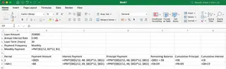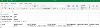 You will also need custom formulas for Remaining Balance, Cumulative Principal, and Cumulative Interest, and to be mindful of absolute ($A$1) vs. relative (A1) references to ensure your formulas work when copied down.