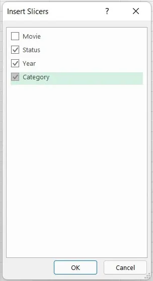 Inserttab on the ribbon and clickSlicer. - In the "Insert Slicers" dialog box, check the boxes for the fields you want to filter by, such as 'Year' or 'Status'.