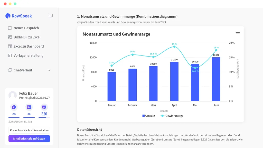 RowSpeak verwandelt unübersichtliche Tabellen in Diagramme, Zusammenfassungen, Dashboards und berichtsfertige Analysen - nicht nur in Chat-Antworten.