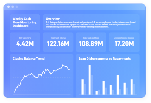 Track inflows and outflows, highlight big movements, and get a simple cash runway summary.