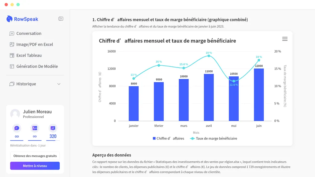 RowSpeak déduit les métriques clés, détecte les anomalies, met en évidence les tendances et organise les résultats autour de questions métier, pas seulement de tableaux bruts.
