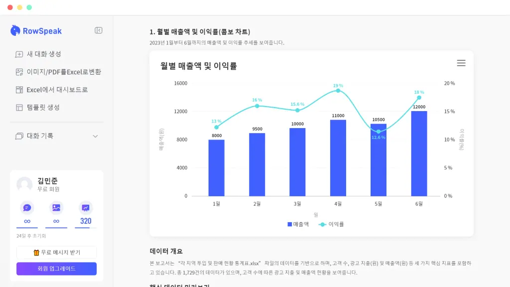 RowSpeak은 복잡한 스프레드시트를 차트, 요약, 대시보드, 보고서용 분석으로 바꿉니다. 단순한 채팅 답변이 아닙니다.