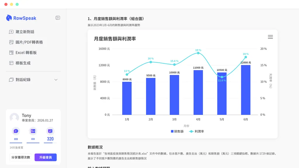 免費方案每月包含 10 次 AI 對話、每次對話最多上傳 2 個檔案(單檔最大 5MB)、20 次圖片轉 Excel,以及 3 次儀表板生成。非常適合在升級前體驗 RowSpeak。